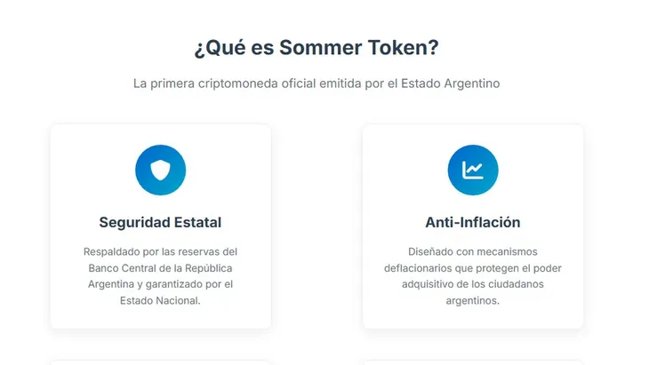 El sitio, que utiliza un dominio .gob.ar, describe a la Sommer Token como «la moneda digital oficial» del Estado argentino, destinada a «combatir la inflación». Se presenta como una «iniciativa revolucionaria del Gobierno Nacional» con el objetivo de «estabilizar la economía y democratizar el acceso a las finanzas digitales».