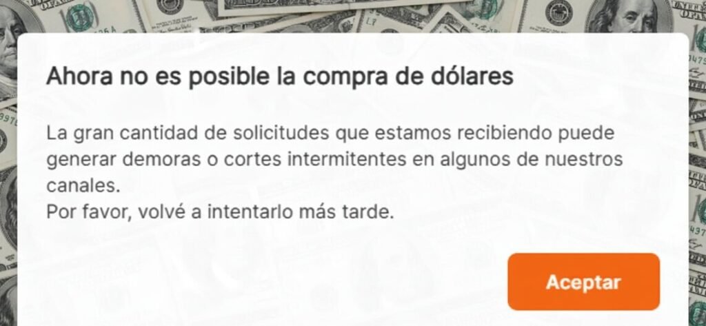 El comunicado emitido por el banco alertaba: «En este momento no es posible la compra de dólares. La alta demanda de solicitudes que estamos recibiendo puede provocar demoras o cortes intermitentes en algunos de nuestros canales. Te pedimos que intentes nuevamente más tarde«.