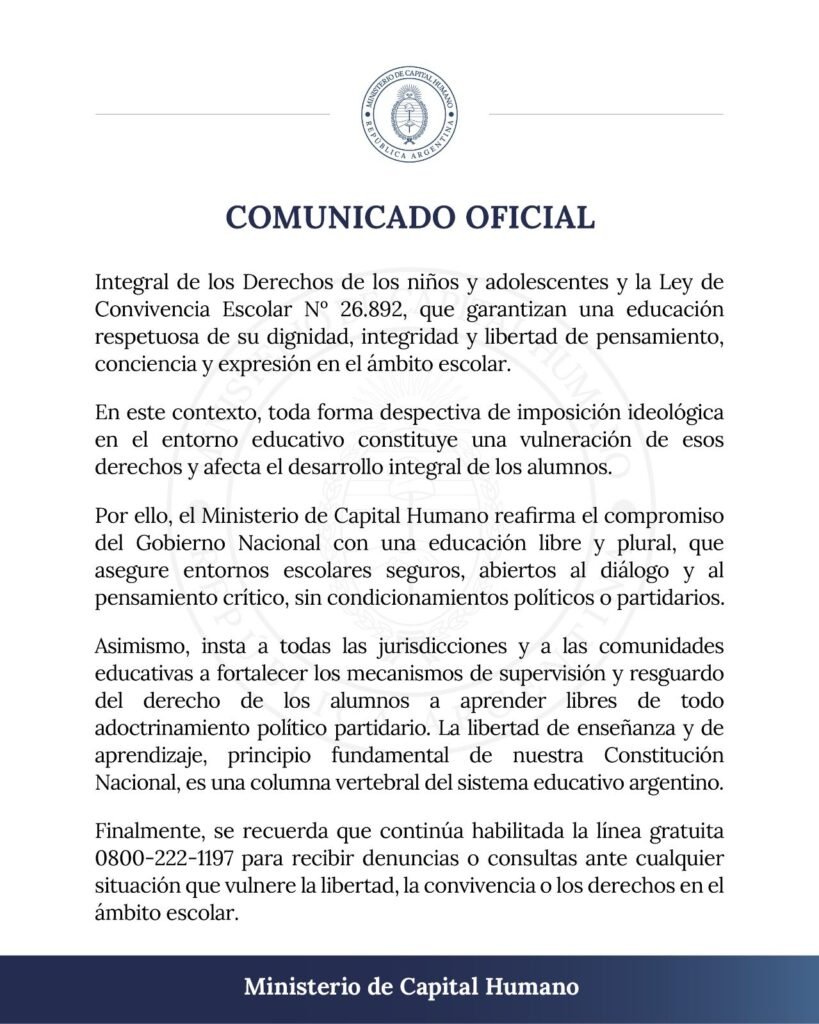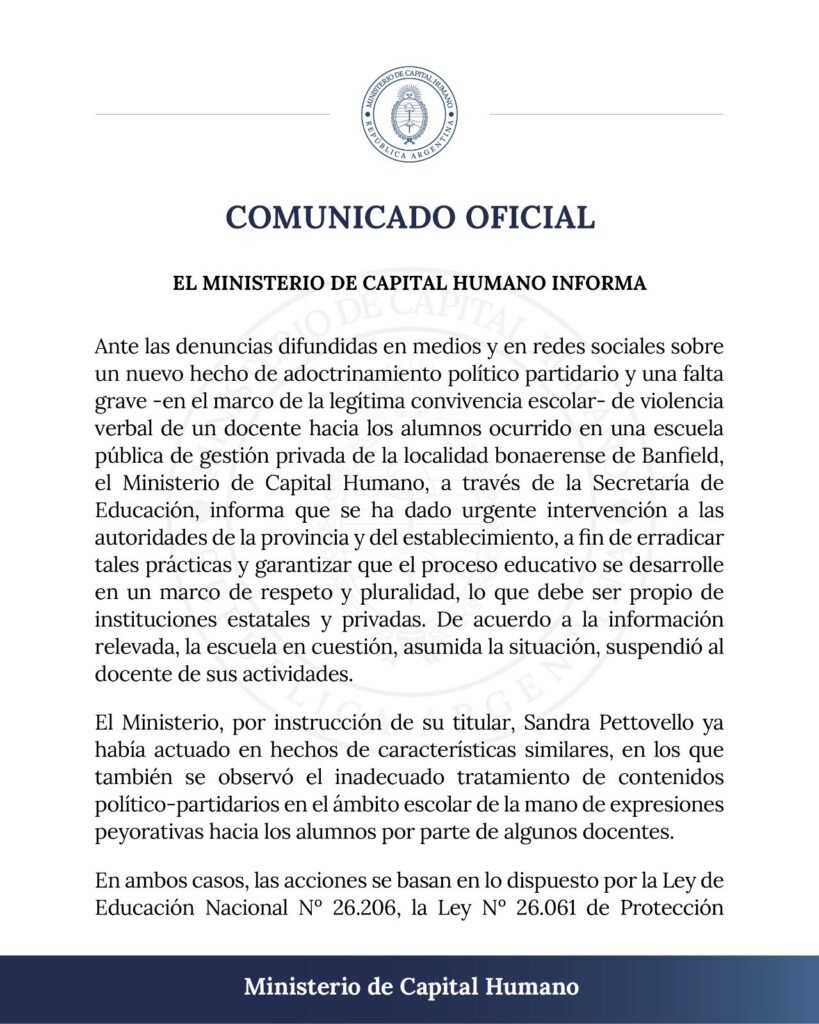 Ante la repercusión del caso, el Ministerio de Capital Humano emitió un comunicado oficial en el que informó que, a través de la Secretaría de Educación, se dispuso la intervención del establecimiento y la suspensión del docente. “La educación debe ser un espacio de libertad, respeto y aprendizaje, no de adoctrinamiento”, expresó Pettovello en su cuenta de X (ex Twitter).