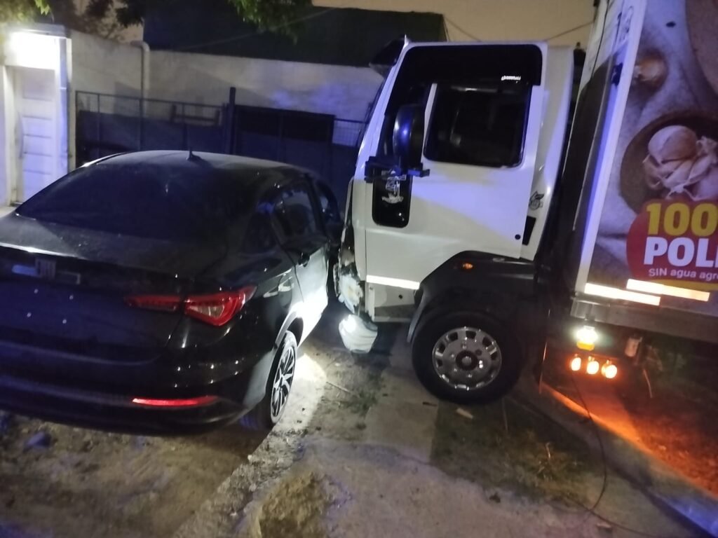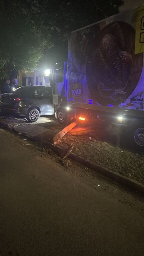 Según relataron los vecinos, el camión avanzó fuera de control por la vereda y tumbó al menos tres postes antes de chocar con el vehículo. En el auto viajaban Ezequiel y su pareja Joana, quienes resultaron heridos y fueron trasladados al Hospital Lucio Meléndez.