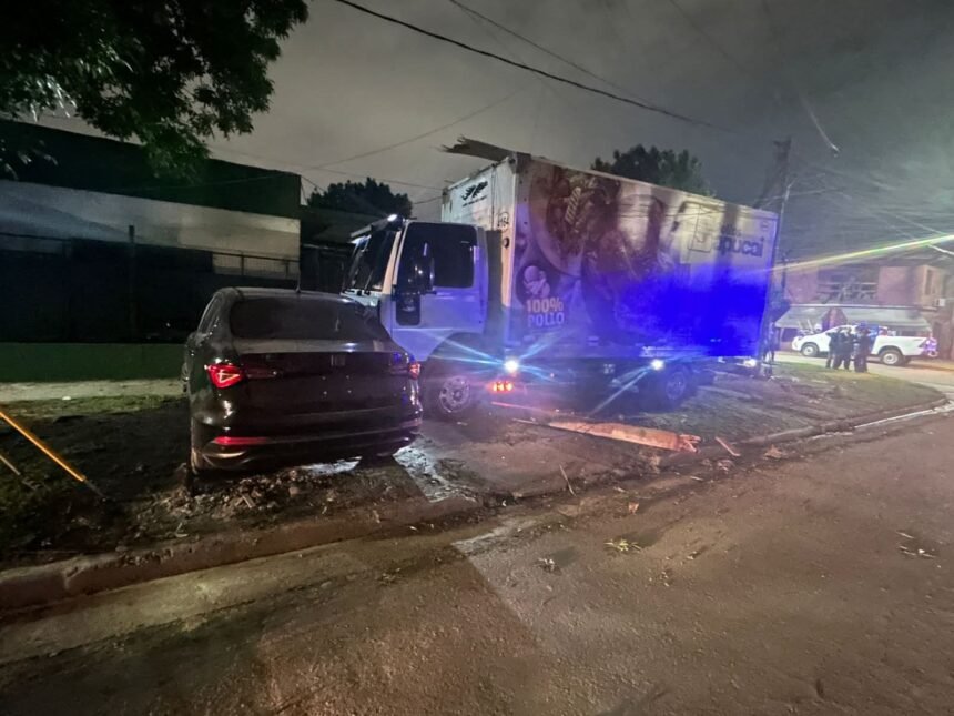 Un camión perdió el control, derribó varios postes del tendido eléctrico y embistió a un auto que salía del garaje