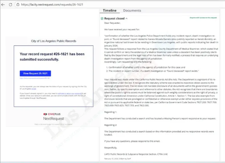 En la misma nota, el medio explicó que solicitó datos al Departamento de Policía de Los Ángeles. Sin embargo, la respuesta oficial del LAPD reconoció un reporte de persona desaparecida a nombre de Narela Micaela Barreto. Pero no registró el hallazgo de ninguna persona fallecida, ni la apertura de una investigación por muerte, ni la existencia de un expediente policial vinculado a un deceso bajo esa identidad dentro de su jurisdicción.