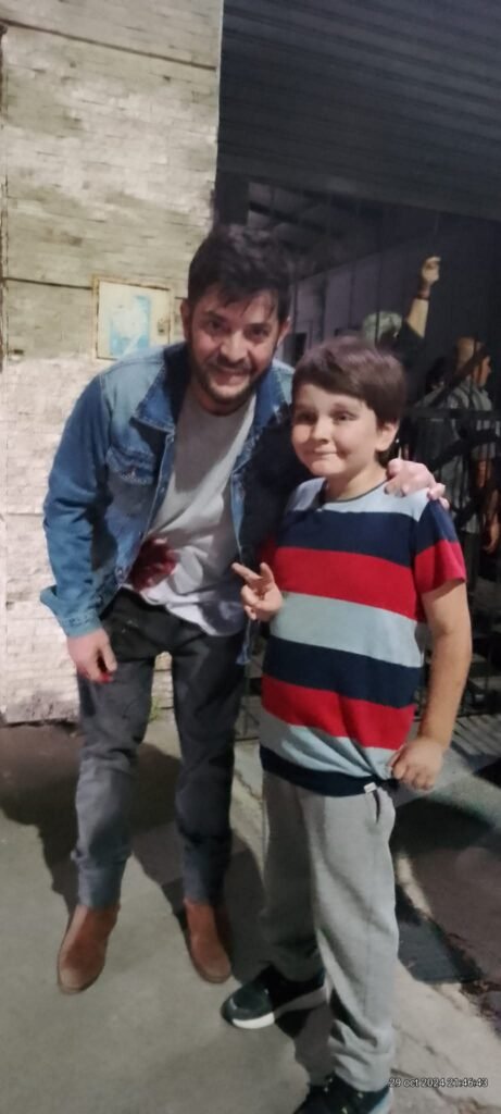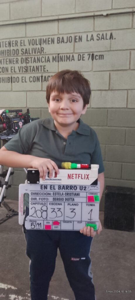 Uno de los momentos más intensos fue la escena del secuestro, filmada de tarde-noche en un taller real, con calor extremo, gritos, disparos simulados y alta carga emocional. Para él fue la escena más difícil, pero los directores y el equipo lo acompañaron y contuvieron en todo momento. “Siempre se filma a contra turno escolar. Él siempre estaba liberado a las 12 como mucho”, explicó.