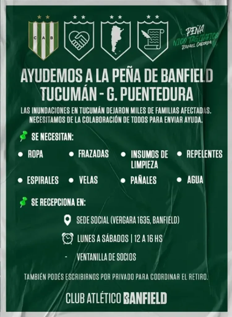 Quienes deseen colaborar pueden acercarse a la sede social del club, ubicada en la calle Vergara 1635, en la localidad de Banfield. Allí funciona el punto de recepción donde se concentran las donaciones. La iniciativa se coordina junto a la Peña Gabriel Puentedura en Tucumán, encargada de distribuir la ayuda entre las familias afectadas.